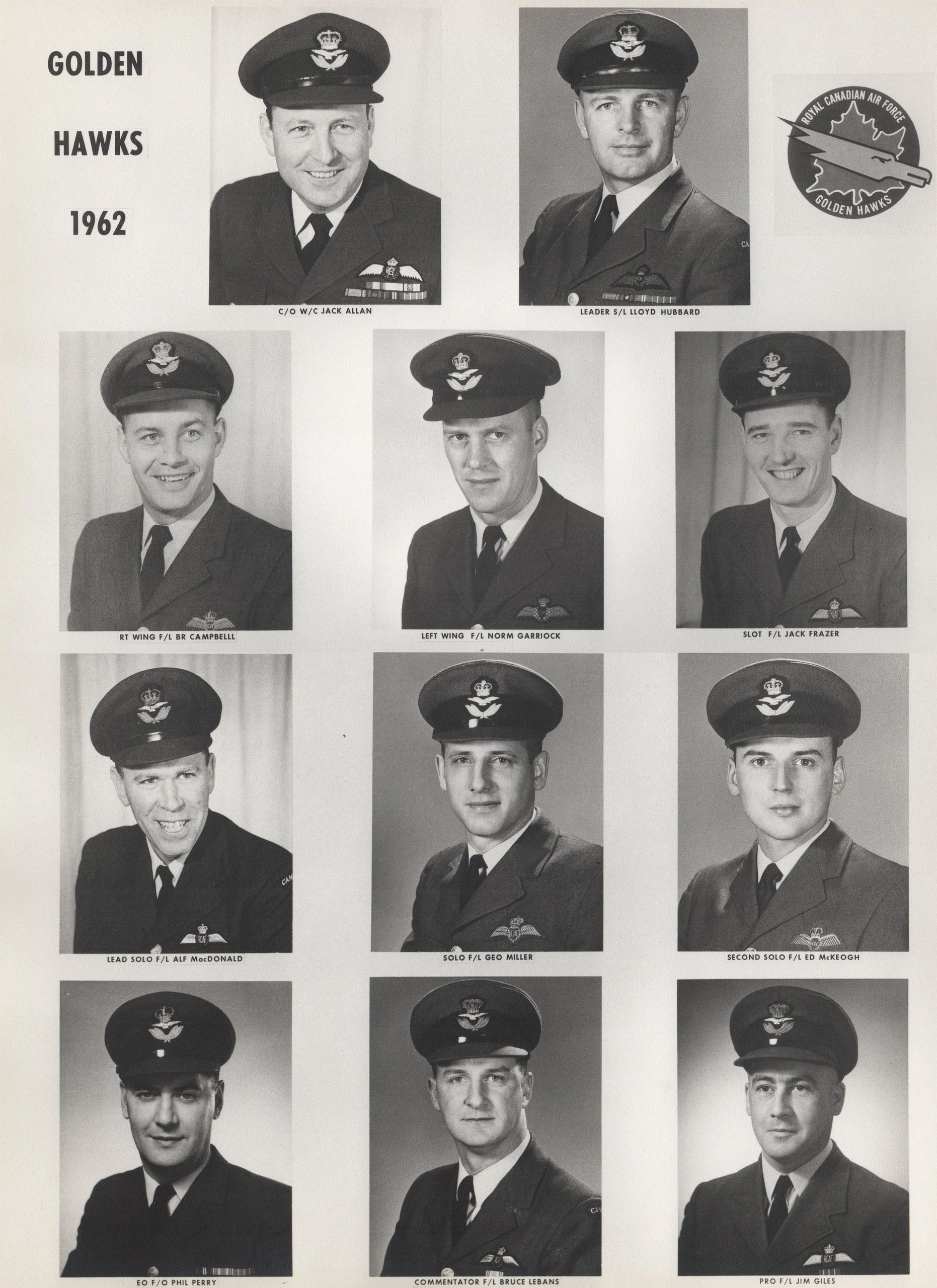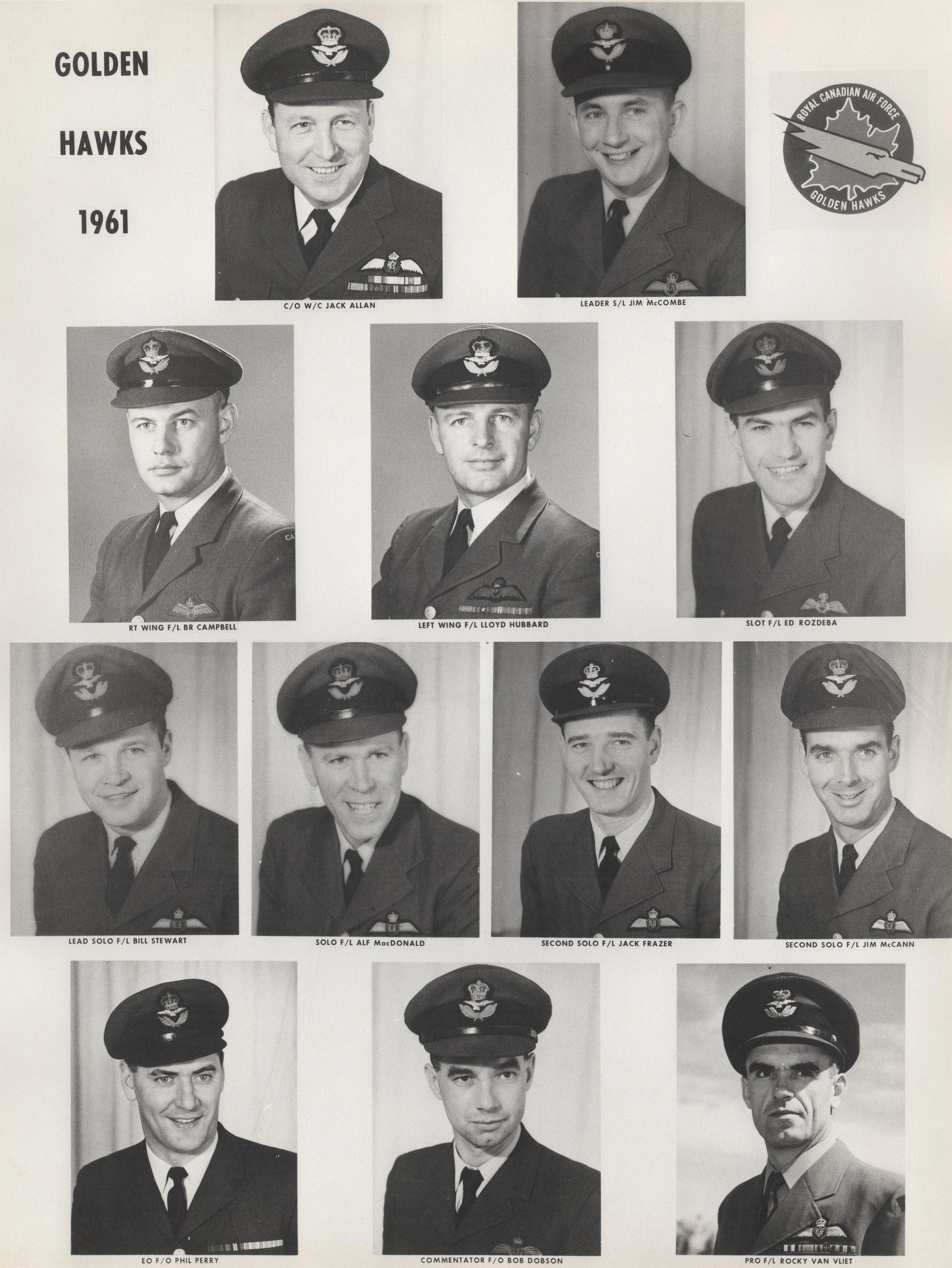 The 1959 Golden Hawk pilots (L - R, front to back): F/O Bill Stewart, F/L Ralph Annis, F/L JT Price, S/L Fern Villeneuve (Team Leader), F/L Jim McCombe, F/L Jeb Kerr, F/O Jim Holt and F/L Ed Rozdeba.
